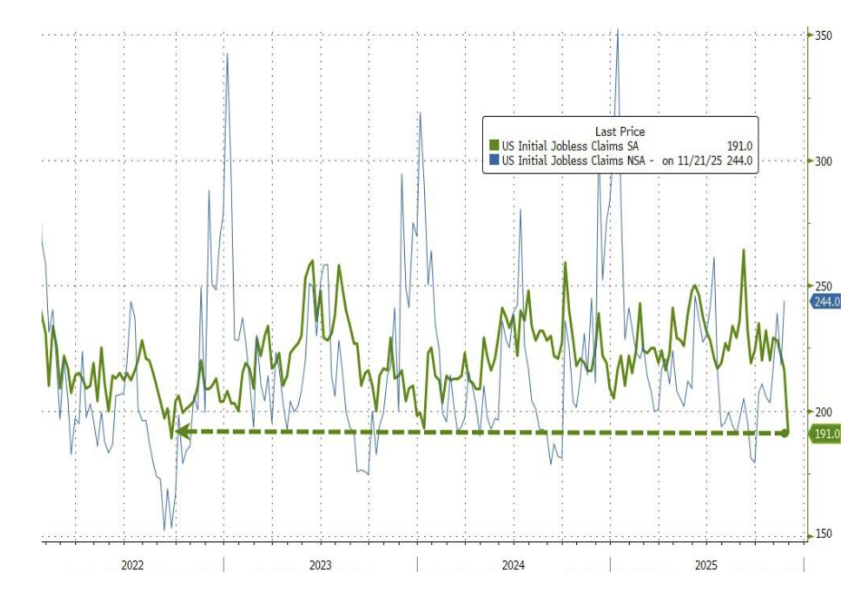美国劳工部周四公布的数据显示,截至11月29日当周(含感恩节假期),首次申请失业救济人数减少2.7万人至19.1万,显著低于市场预期的22万及前值21.6万。
