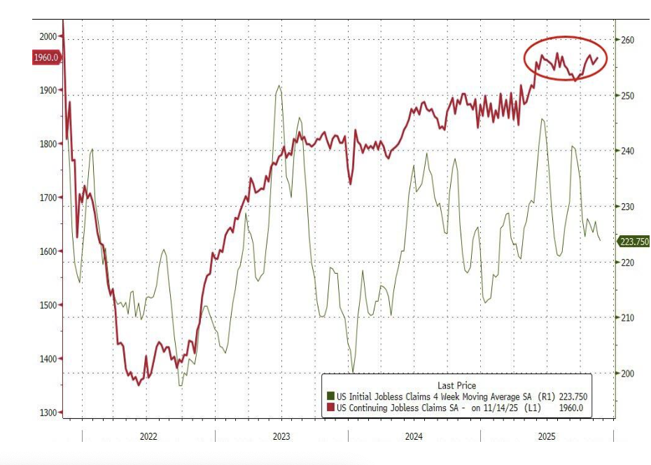 数据显示,截至11月22日当周,持续申请失业救济人数小幅下降4000人至193.9万人。然而,该指标持续处于近年来高位,显示失业者再就业难度较大,劳动力市场承压,预示着失业率后续或将继续面临缓慢上升的压力。