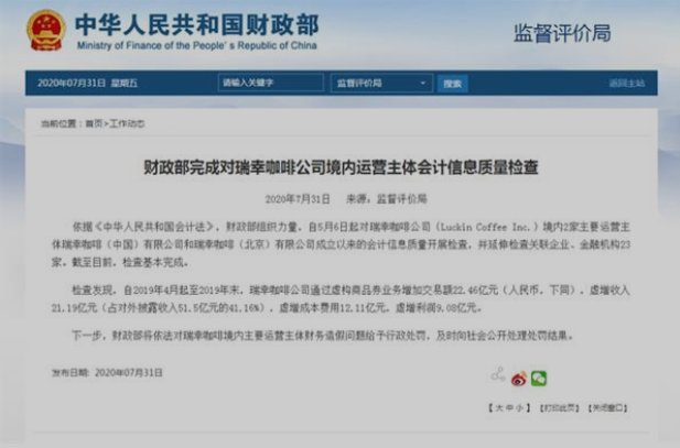 7月31日傍晚,财政部首先发布消息称,财政部已完成自5月6日起对瑞幸咖啡公司境内运营主体会计信息质量检查。检查发现,自2019年4月起至2019年末,瑞幸咖啡公司通过虚构商品券业务增加交易额22.46亿元人民币,虚增收入21.19亿元人民币(占对外披露收入51.5亿元的41.16%),虚增成本费用12.11亿元,虚增利润9.08亿元。
