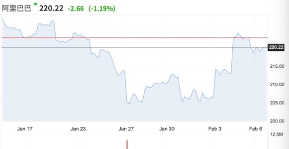 “阿里巴巴从在2018年的212美元附近开始出现大幅回调,2019年整体呈现震荡格局,从2018年的顶部到2019年10月形成一个收敛三角形,从2019年10月开始突破,最高至230美元附近。”司徒捷称,“受此次疫情影响,阿里巴巴于2020年1月27日最低跌至203美元附近,近期企稳反弹于220美元。若是本周能够周线收阳,那么也预示着美股对疫情的反应转弱,若疫情不进一步发酵,后续市场会进一步回升。”