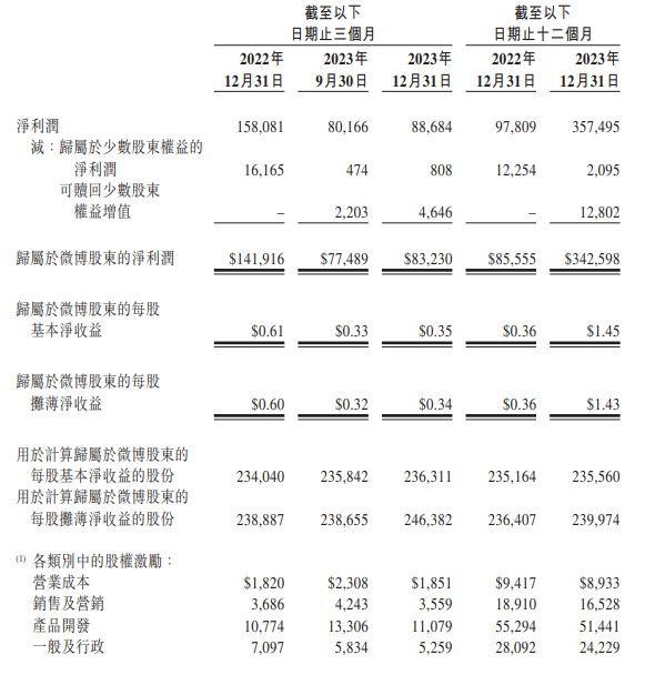 财报显示,微博四季度净营收同比增加3.5%至4.637亿美元,高于市场预期的4.543亿美元;经营利润为1.19亿美元
