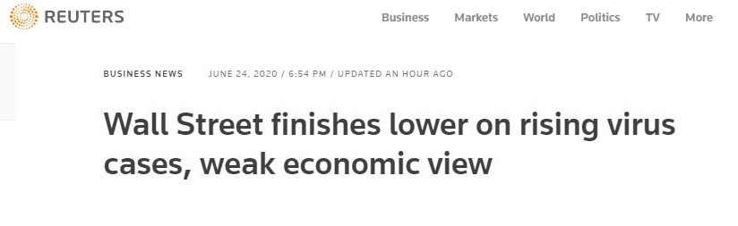 路透社:病例增加、经济前景暗淡美股创近两周来最差表现
