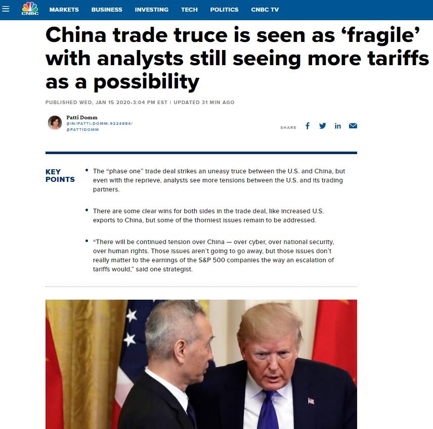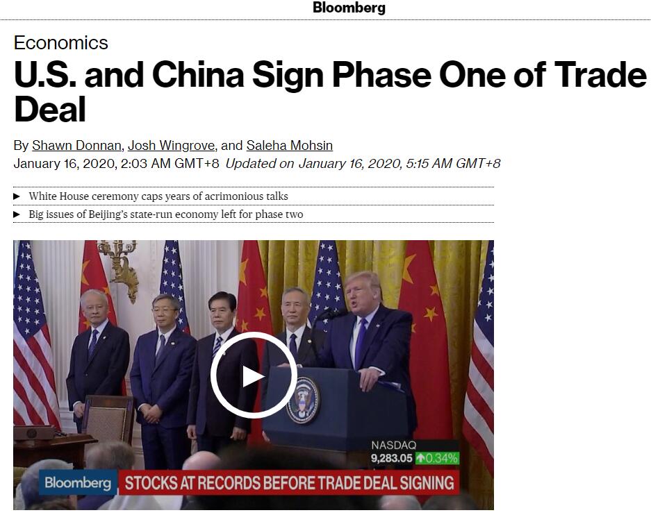 在外界对特朗普改写中美经济关系的努力会不会更进一步保持怀疑态度时,本周三,中美签署了第一阶段的贸易协议。根据协议,中方将进一步打击盗版和窃取企业机密,同时购买2000亿美元美国商品,缩小中美贸易失衡,中方将避免操纵汇率。协议还纳入了执行系统,以保证履行协议承诺。