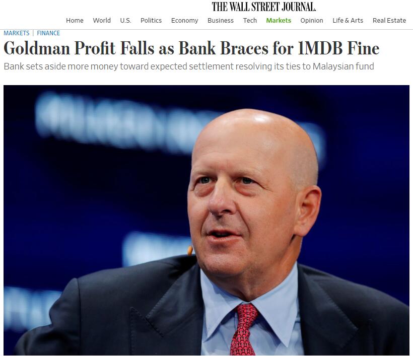 华尔街日报 | 1MDB罚款拖累高盛盈利下降