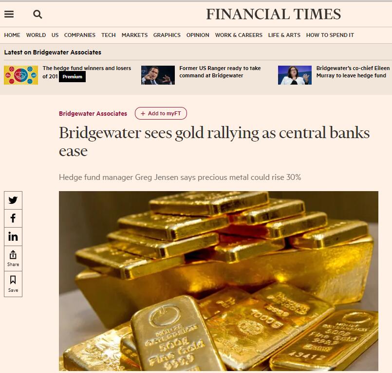 英国金融时报 | 桥水首席投资官:金价有望上涨30% 达到2000美元/盎司