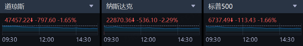 美东时间周四,美股三大股指全线下挫,人工智能龙头英伟达等重量级科技股遭到猛烈抛售。随着美联储降息预期骤降,市场整体情绪明显承压。截至收盘,道指跌797.60点,跌幅为1.65%,报47457.22点;纳指跌536.10点,跌幅为2.29%,报22870.36点;标普500指数跌113.43点,跌幅为1.66%,报6737.49点。