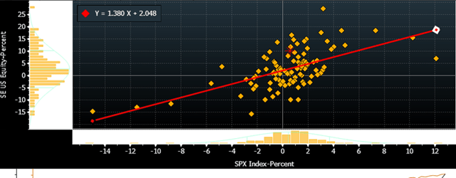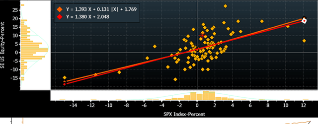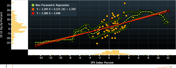 We have tried to assess SE beta and checked SE correlation to the market (table 2, 3, 4, and 5). The highest correlation is toward S&P500, but linear Beta, Beta +/-, and non-parametric all show an R^2 around 0.4, which indicates that SE is decorrelated from the S&P 500 Index (a similar story for other indexes). Beta is thus not useful to the extent of our analysis.