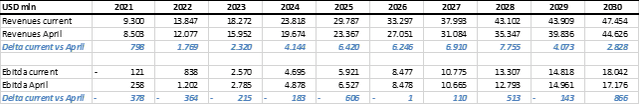 It is worth noting in the table below that, while consensus has fairly factored higher FY21 revenues guidance on both Garena and Shopee, EBITDA compared to April 2021 has been downward revised at a consolidated level not only in 2021. EBITDA has been cut from 2021 to 2026.
