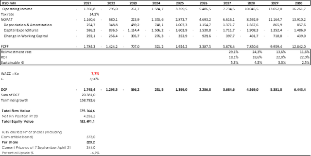 Factoring a 3.5% terminal growth rate and the fully diluted number of shares, the discount rate, which delivers around USD 180 bn market cap, is 7.7%!