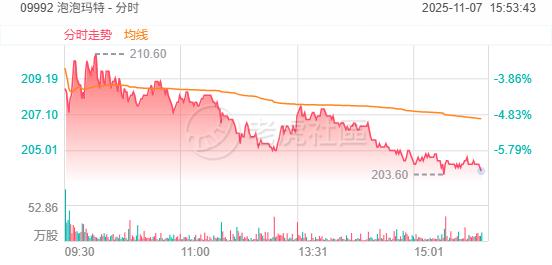 港股新消费概念尾盘持续走弱,泡泡玛特跌超6%,沪上阿姨跌超5%