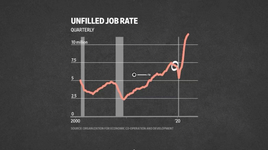 因为越来越多的人离开了劳动力市场。更多的工作岗位出现也就随即出现,再加上一场疫情,部分企业他们找不到人来填补1100万个工作岗位。比如2019年,当时的经济被认为异常强劲,有700万个空缺职位。而我们现在的就业机会比上次经济700万的高峰期还要多400万个。