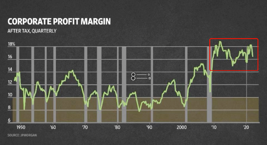 但与以往的经济衰退相比,企业现在的处境有所不同。这张图表显示企业利润率。我们可以看出企业平均利润率都在个位数。其中一次是由企业驱动的衰退。比如2001年由于企业过度投资。于是他们决定削减开支以恢复利润率,而这直接导致了经济衰退。