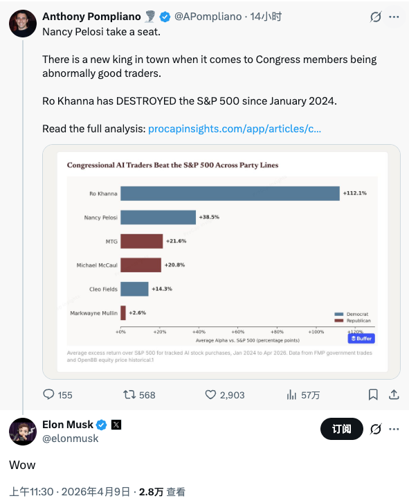 ProCap Insights对国会议员股票披露数据的分析显示,从2024年1月至2026年4月,卡纳通过布局AI相关公司,实现了高达112.1%的超额收益(alpha),即扣除大盘表现后的额外回报。这一成绩不仅大幅跑赢同期标普500指数,也显著领先佩洛西同期38.5%的超额收益,在国会议员中处于领先地位。