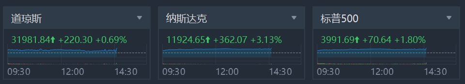 美股短线拉升,纳指涨超3%,标普500指数涨1.8%,道指涨0.7%。