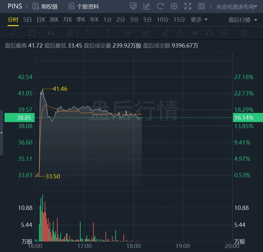 财报发布后,Pinterest盘后一度大涨逾23%,随后涨幅收窄至逾16%。