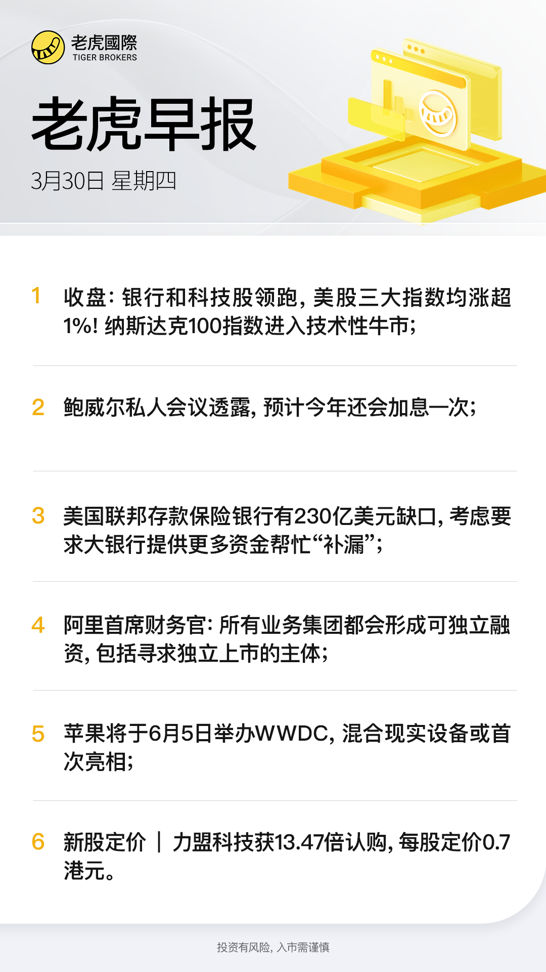 1、美股收高三大指数均涨超1% 纳斯达克100指数进入技术性牛市