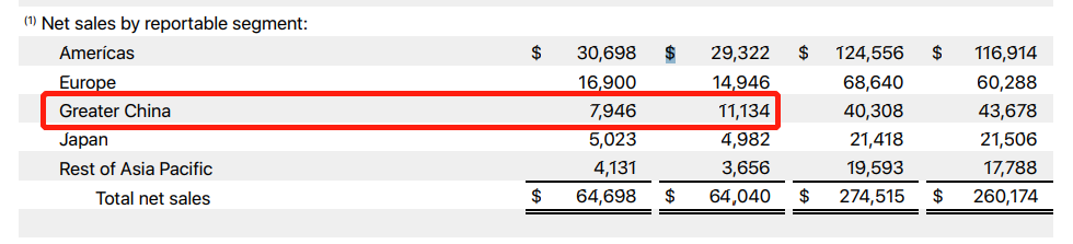 按地区来看,苹果大中华区营收明显下滑。第四财季大中华区销售额79.5亿美元,去年同期为111.3亿美元。