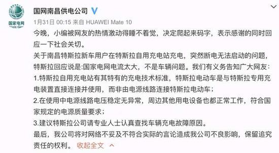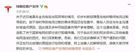 2月1日,自知理亏的特斯拉方面给出回应,初步判断故障是充电瞬间电流过载导致,故障出现后只是提供多种因素供用户参考,网络传播录音内容存在剪辑,向国家电网道歉。