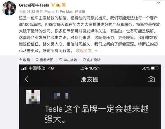 实际上,在陶琳的微博上,从来都只是这些“正能量”的内容,而对于那些反应特斯拉负面的情况,这位主攻公关工作的女总裁,从来都是视而不见,甚至还会把车主拉黑。