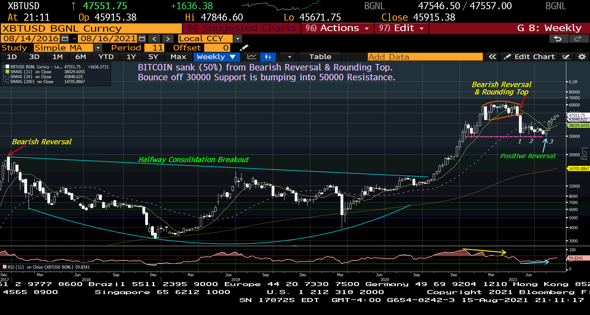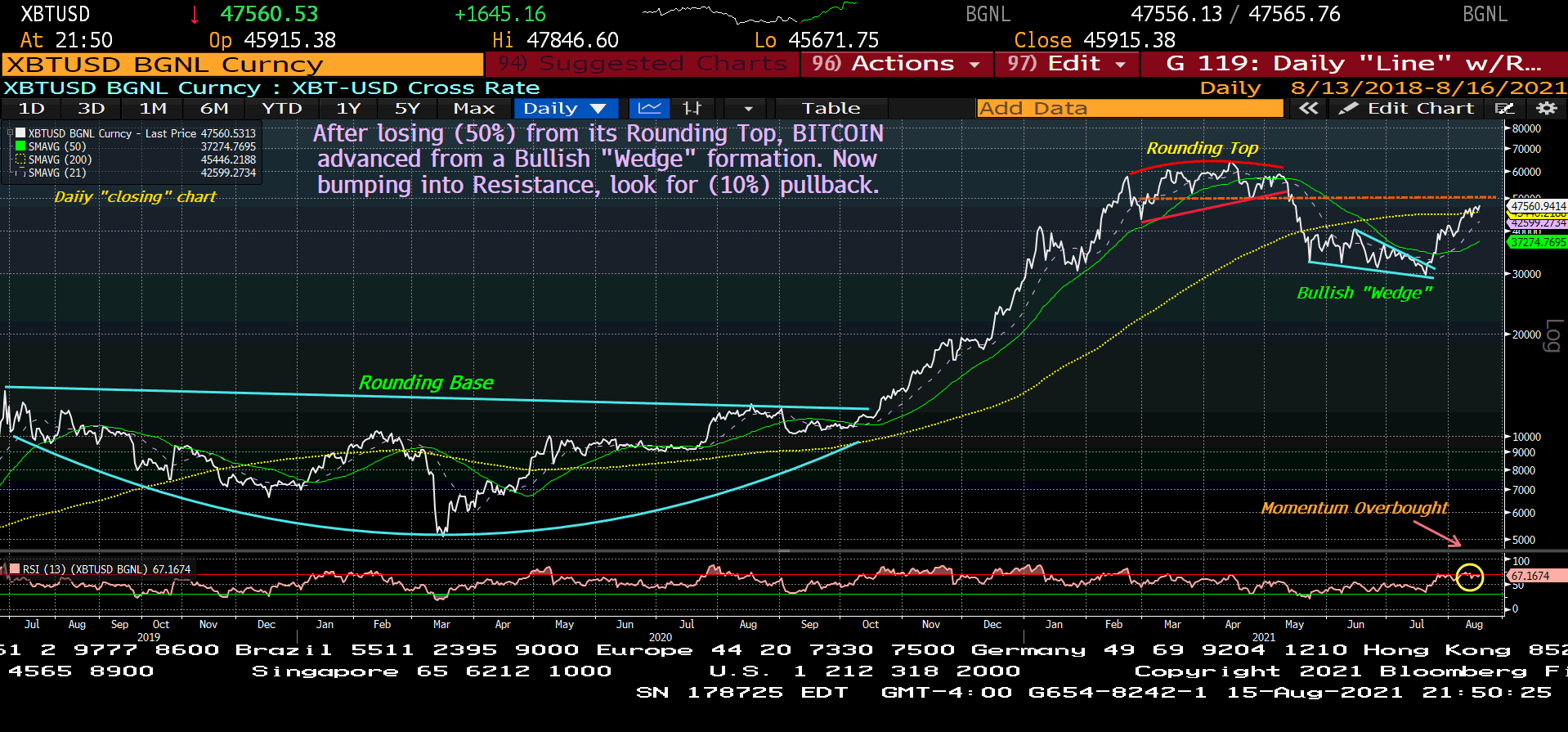 A daily closing chart shown next illustrates in greater detail the rounding top and $50,000 resistance barrier. The rally off $30,000 support is nearing a $50,000 trendline resistance—just as momentum is overbought. That’s another reason why a pause/pullback is likely to begin by next week.
