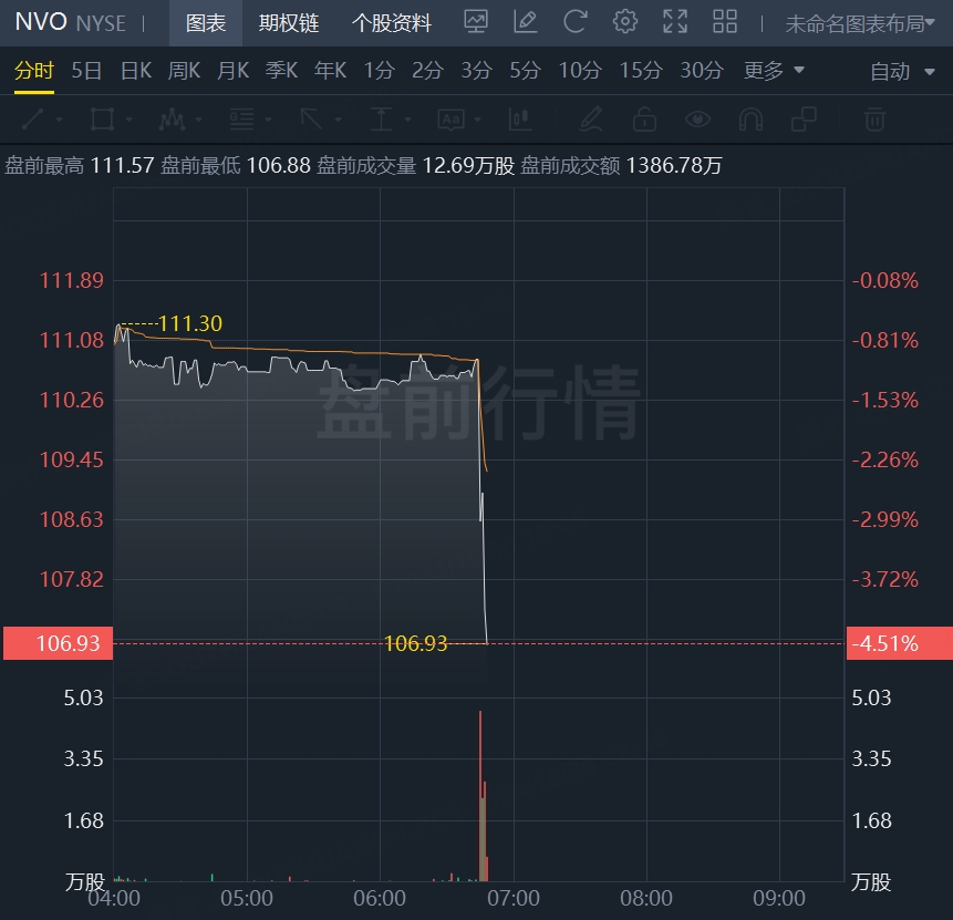 财报公布后,礼来美股盘前大跌10%,诺和诺德跟随走低,现跌超4%。