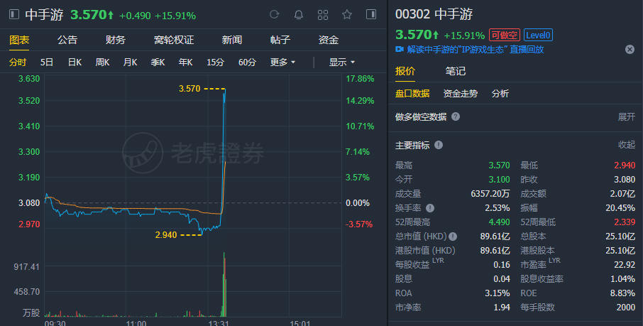 截至当前,中手游涨近16%,报3.57港元。