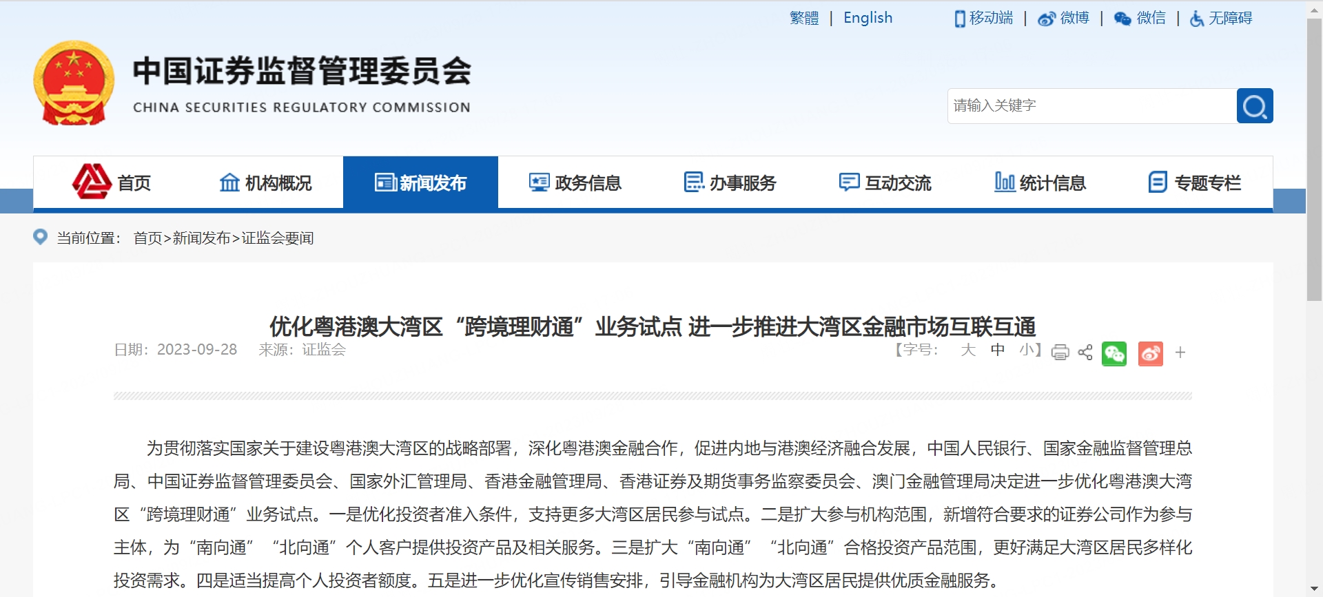 9月28日,中国人民银行、国家金融监督管理总局、中国证券监督管理委员会、国家外汇管理局、香港金融管理局、香港证券及期货事务监察委员会、澳门金融管理局决定进一步优化粤港澳大湾区“跨境理财通”业务试点。