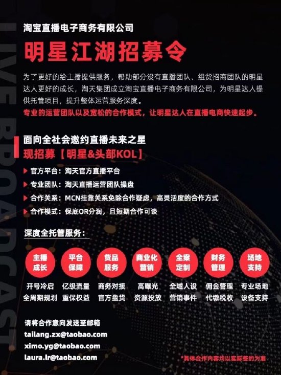 2月20日下午消息,淘宝宣布成立直播电商公司,为有意入淘开播的明星、KOL、MCN机构提供“保姆式”全托管运营服务。据了解,这项服务主要面向初入淘的“新手玩家”,为其提供精细化的托管运营服务,帮助其快速上手,适应淘系生态玩法。
