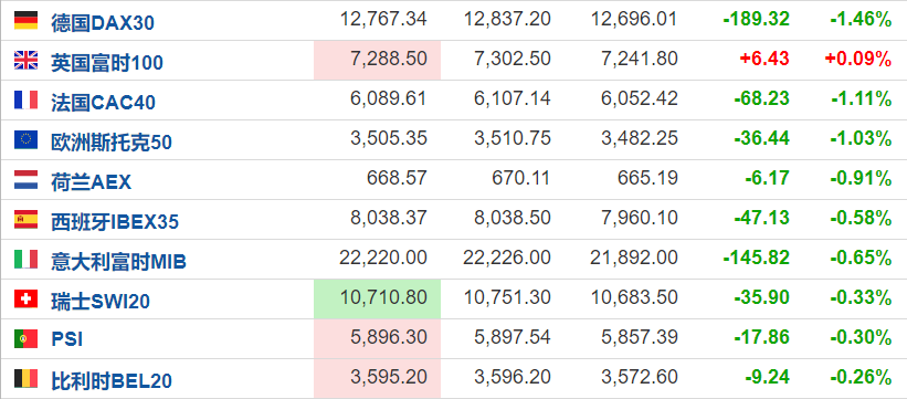 欧洲主要股指普遍走弱,截至发稿,德国DAX30指数跌1.46%,法国CAC40跌1.11%。原油