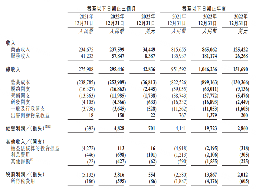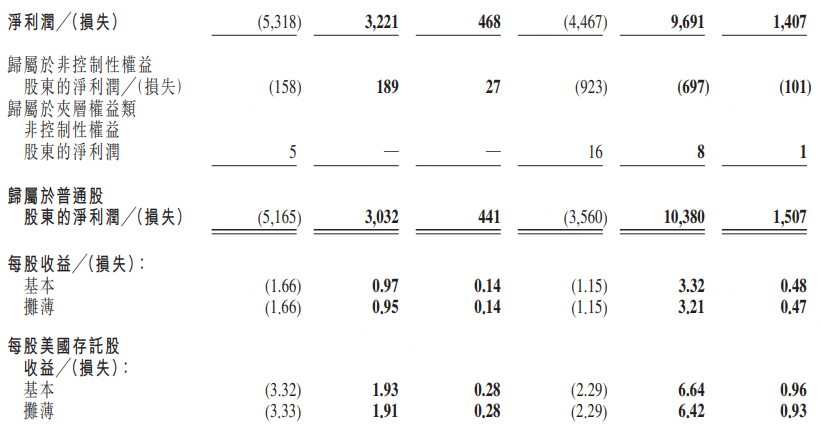2022年全年收入为10,462亿元,较2021年全年增加9.9%;2022年全年归属于普通股股东的净利润为104亿元,2021年全年为净损失36亿元。