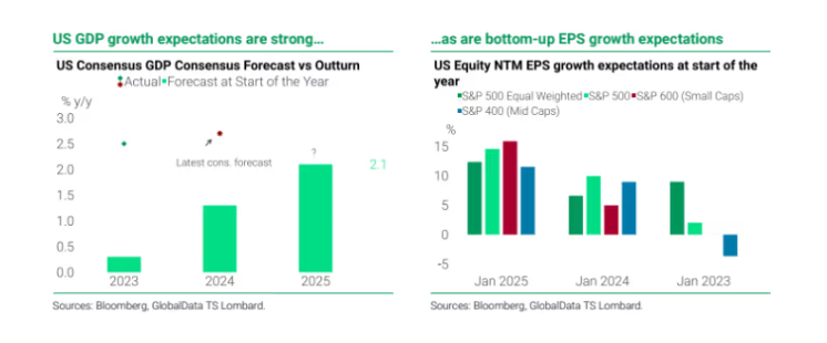 然而,对美国2025年经济增长率的普遍预测达到2.1%,明显比过去两年的预测要乐观得多。Von Ahlen表示,这“表明在全球政策不确定性加剧且估值(相对于债券而言)变得更加昂贵的情况下,股市已经变得更加脆弱”。