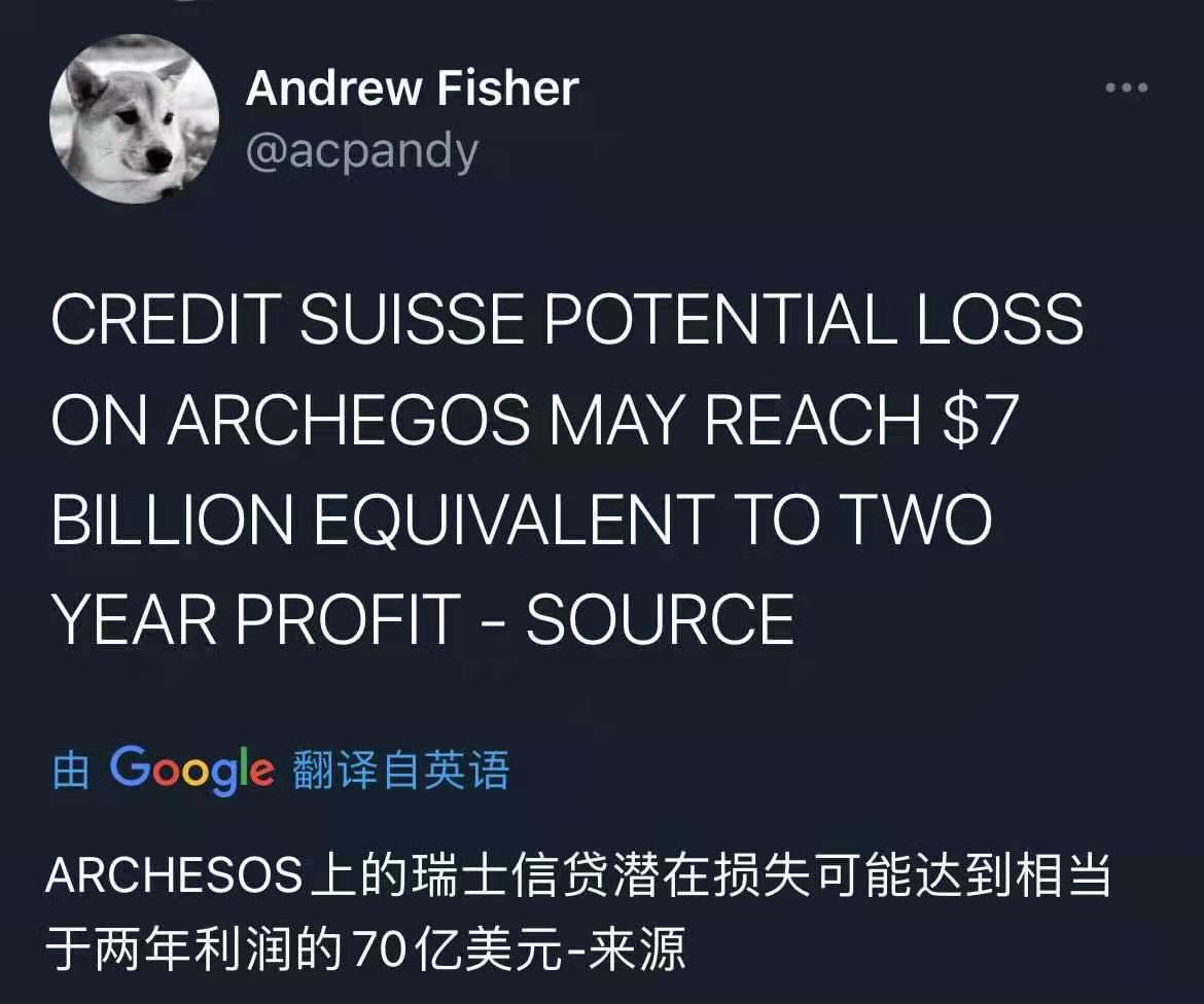 市场传言在Archegos的爆仓事件中,瑞信的潜在损失可能达到70亿美元,远高于此前亏损30-40亿美元的预期。