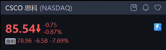 周四, 思科 盘前大跌近8%。上一财季营收和盈利均两位数增长,营收还创单季最高纪录,并上调本财年的指引,但疲软的当前财季毛利率指引令投资者担心,人工智能(AI)需求固然能提高收入,相关支出却侵蚀盈利能力。