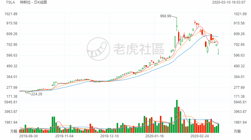 受到美股大盘崩跌拖累,特斯拉周一跌幅超过13%至608美元,促使该股陷入了熊市,较历史高位下跌了37%。