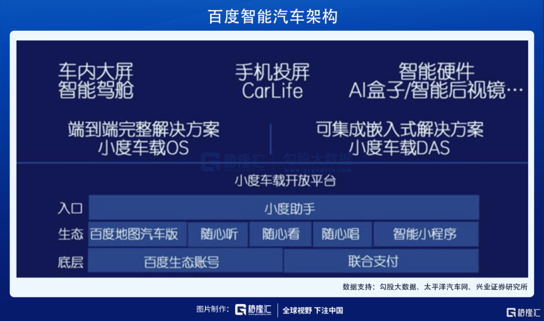 而百度从2013年开始便发力汽车领域,包括了高精度地图、定位、感知、智能决策与控制四大模块,并陆续推出了包括小度车载开放平台、CarLife战略、Apollo计划等。值得一提的是,Apollo在车、路、行的商业化应用和小度车载系统平台的普及使用率都以处于行业领先。本次百度成为以第一个整车制造企业的身份入场的巨头,更是实现了两条腿走路的战略。