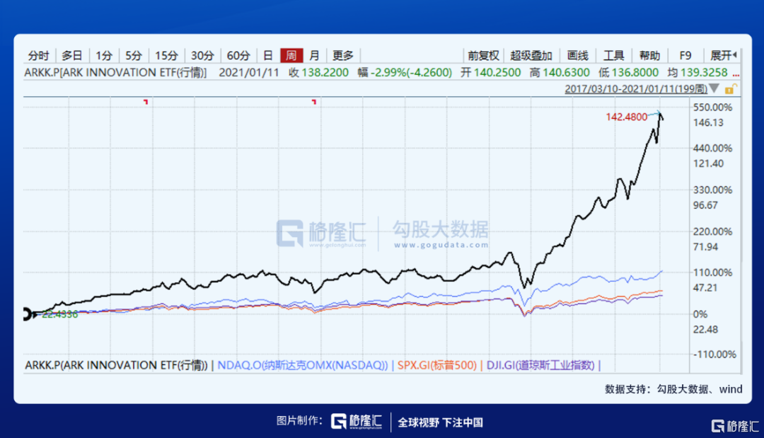 ARK作为专注颠覆性创新科技领域的明星基金,风格激进、屡屡精准抓住超级明星股,因而盛名在当下可谓如日中天。其旗下颠覆性创新主题基金ARKK,在过去5年的净值累计增长了超5倍,吊打同期美股三大指数,表现遥遥领先市场巨大多数的主题基金。