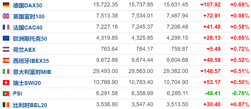 欧洲主要股指普遍上涨,截至发稿,德国DAX30指数涨0.69%,法国CAC40指数涨0.58%。