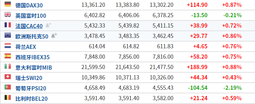 欧洲主要指数涨多跌少,欧洲斯托克50指数涨0.86%,英国富时100指数跌0.21%,德国DAX30指数涨0.87%。