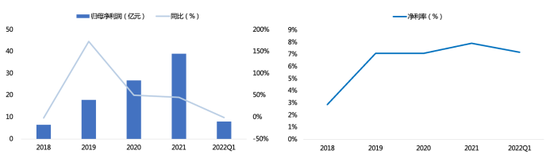 在利润端,2021年,实现归母净利润39.09亿元,同比增长45.52%;同期净利率为7.92%,同比上涨0.83pct。趋势上,得益于公司的收入的增长,叠加成本管控能力的加强,公司的归母净利润与净利率在近年同时保持增长态势。
