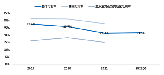 分地区来看,非洲一直是公司最重要的的市场。近年来,随着公司加大了对印度等新兴市场的开拓力度,营收结构也从“非洲市场为主导”转变为“两大市场平分天下”的格局。2021年,非洲市场的营收占比下降至49.1%,与此同时,亚洲及其他新兴市场的营收占比上升至49.2%,份额已经与非洲市场持平。