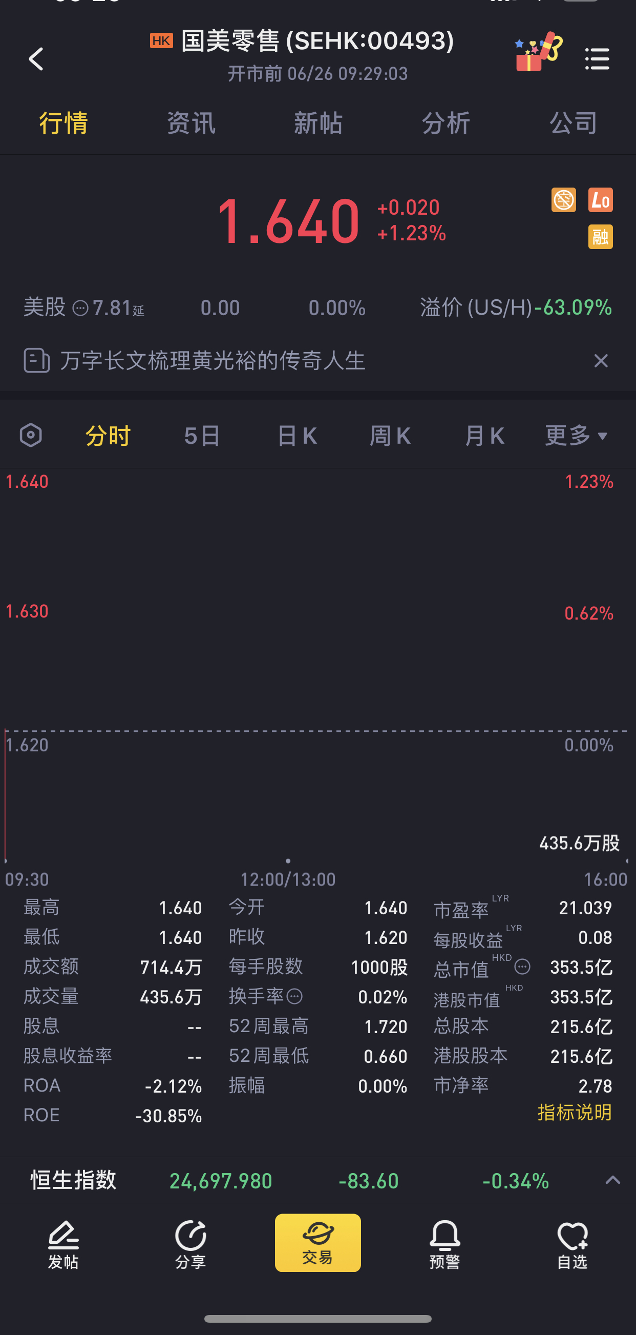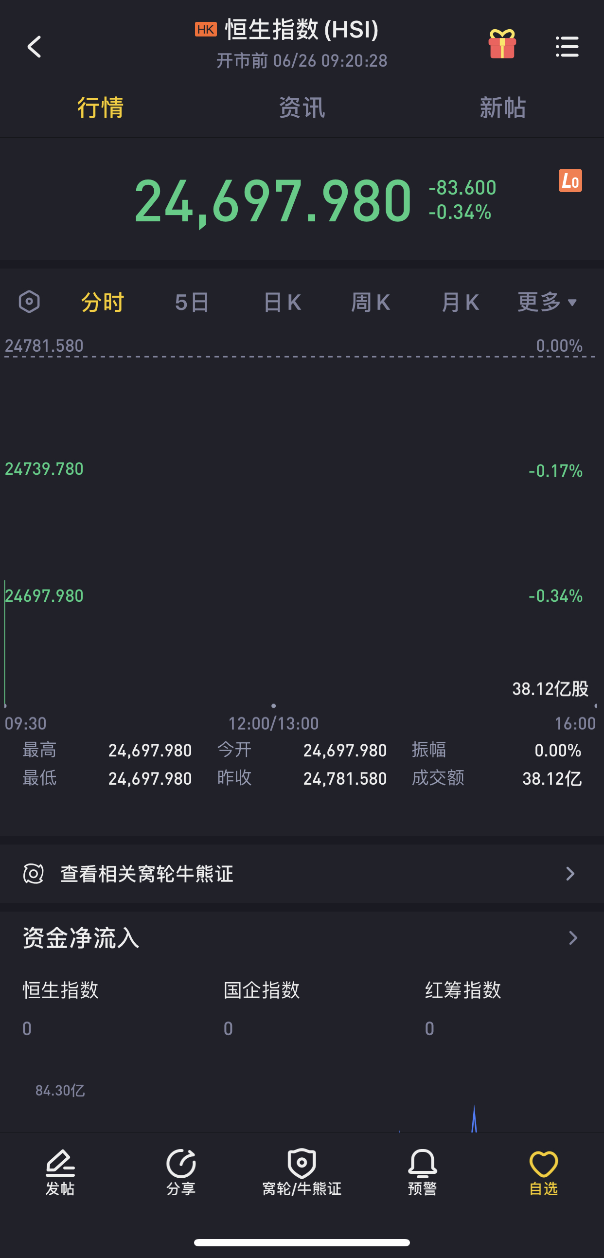 6月26日(周五),恒生指数开盘下跌83.60点,跌幅0.34%,报24697.98点;国企指数开盘下跌56.69点,跌幅0.57%,报9879.97点;恒生红筹指数开盘下跌30.12点,跌幅0.78%,报3841.33点。