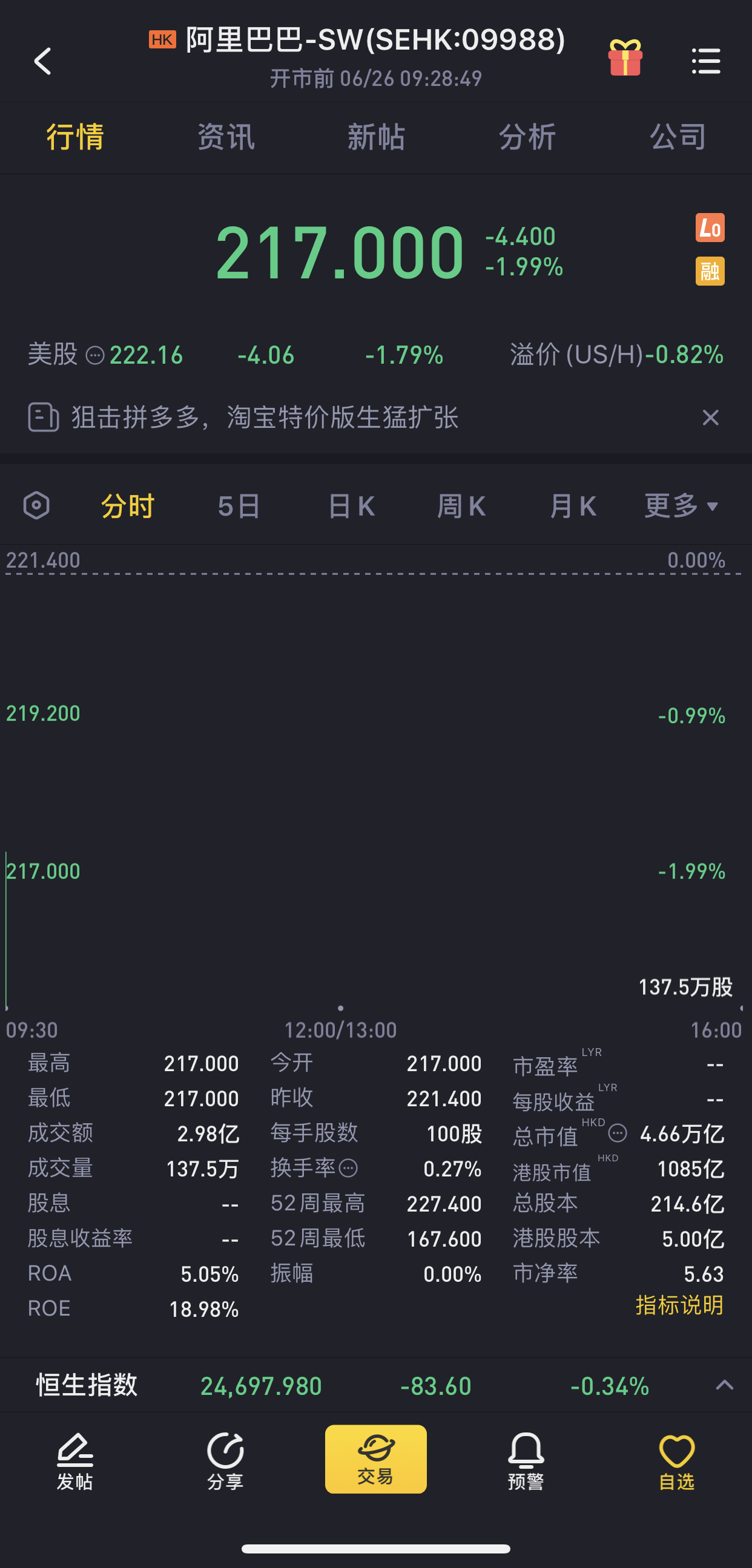 孙正义官宣退出阿里董事会,阿里低开近2%。
