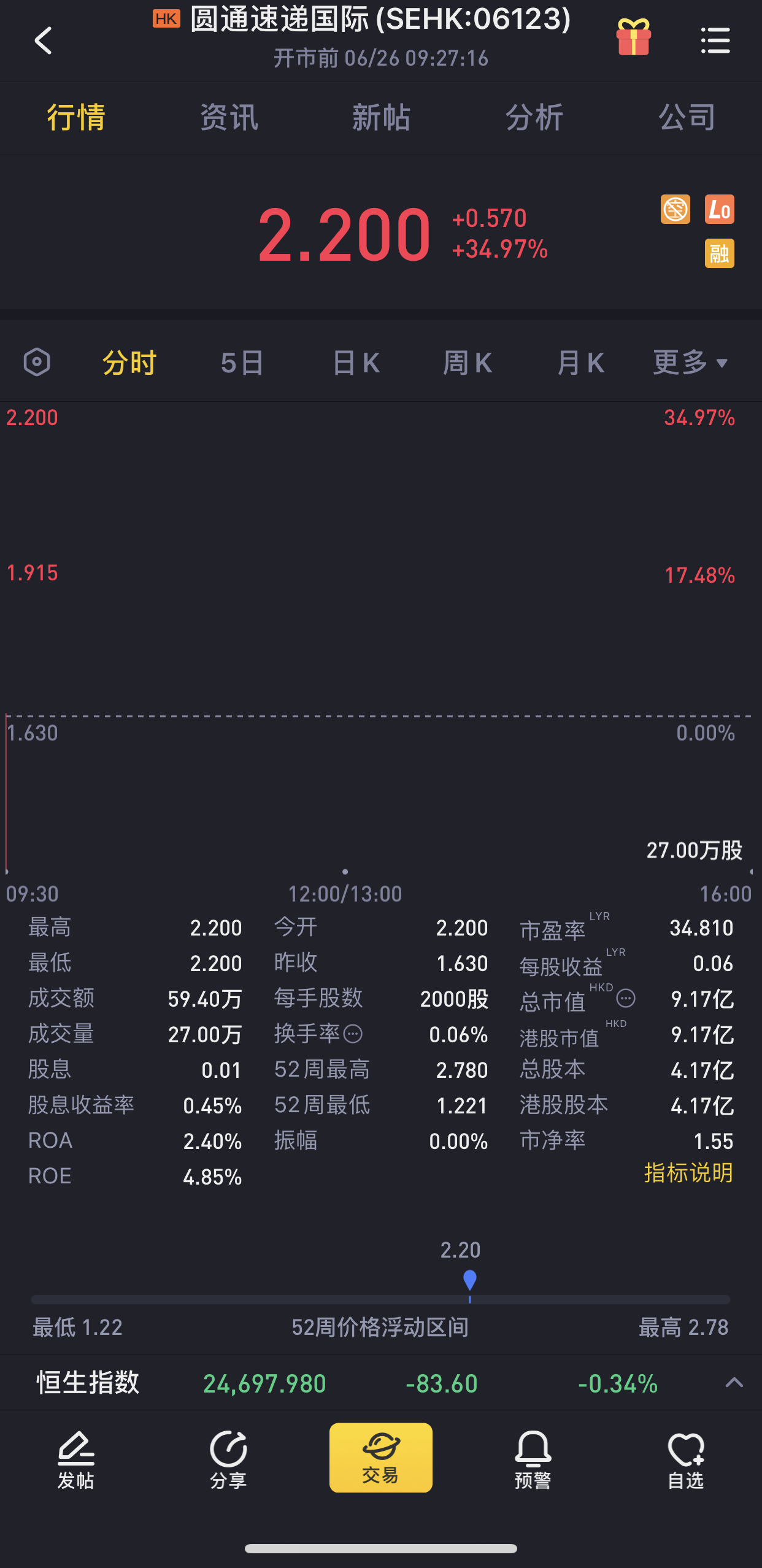 圆通速递国际大幅高开近35%,报2.2港元,总市值9.2亿港元。圆通速递国际(06123.HK)公告,截至2020年6月30日止6个月,预期集团较2019年相应期间录得收益增加及纯利大幅增加。截至2020年6月30日止6个月,预期集团纯利较2019年相应期间纯利增加约1000%。