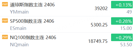 5月24日,美股三大股指期货上涨,截止发稿,道指期货涨0.13%,纳指期货涨0.29%,标普500指数期货涨0.28%。