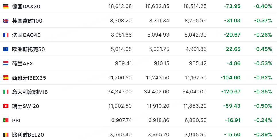欧洲主要指数集体下跌,德国DAX30涨跌0.40%,法国CAC40跌0.26%。