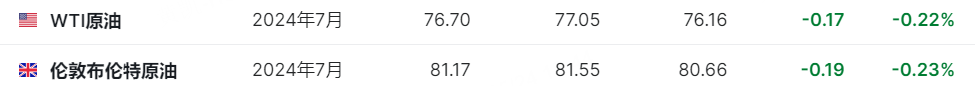 国际油价下跌,美油报76.70美元/桶,日内跌幅0.22%;布油现报81.17美元/桶,日内跌幅0.23%。