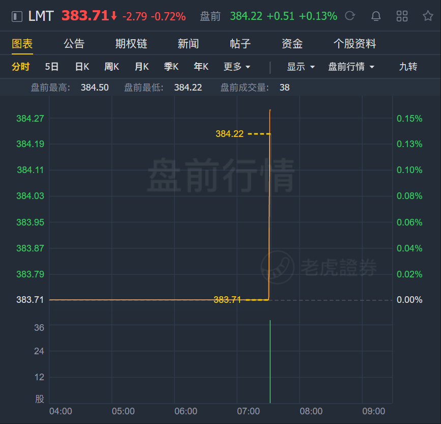 财报发布后,洛克希德马丁盘前股价迅速拉涨,截止发稿,涨0.13%,报384.22美元。