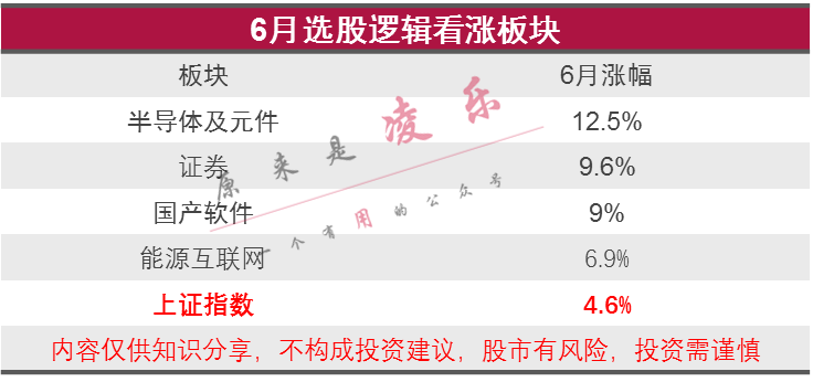 回顾上个月的选股逻辑,最后主要看涨了半导体、证券、国产软件和能源互联网四个板块,涨幅均大于上证指数,特别是半导体和证券板块,持仓的朋友们都知道,涨幅是远远大于市场,知识星球中好多朋友单月收益超过20%,持有涨停板更是日常之事。