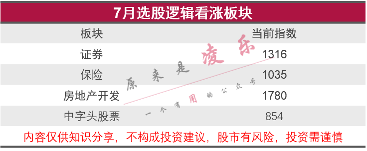 这两个热点新闻都是直接利好证券板块,我6月份也一直在知识星球中不断地强调,所以证券相关产业链仍是7月重点看涨的板块,另外,金融行业往往具有带动作用,证券一般能带一带保险和期货,带不动银行。