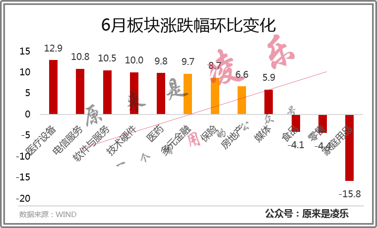 下图我统计了6月板块涨幅榜对比5月的变化,涨幅变化最大的还是医疗设备和电信软件,市场对这些板块的看涨力度还在加强,但是食品、零售和家庭用品板块环比大幅度下跌,市场对零售板块的炒作明显熄火,此时你如果还要入场,恐怕也是被套牢在山巅。